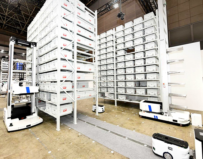 智能搬運:4臺料箱機器人負責庫內(nèi)高位料箱搬運,將高層料箱精準轉(zhuǎn)移至底層待取位。